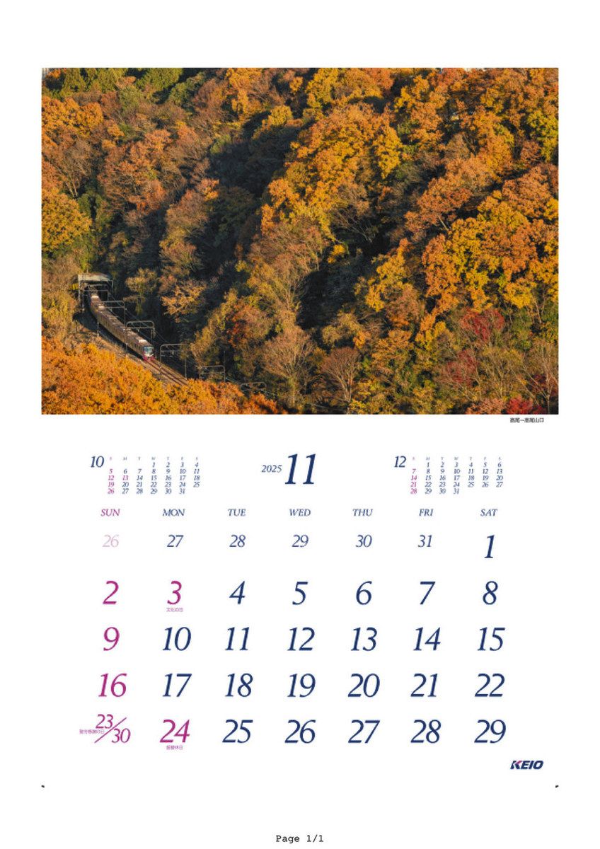 高尾-高尾山口を走る列車の写真を掲載した来年11月のカレンダー(京王電鉄提供)