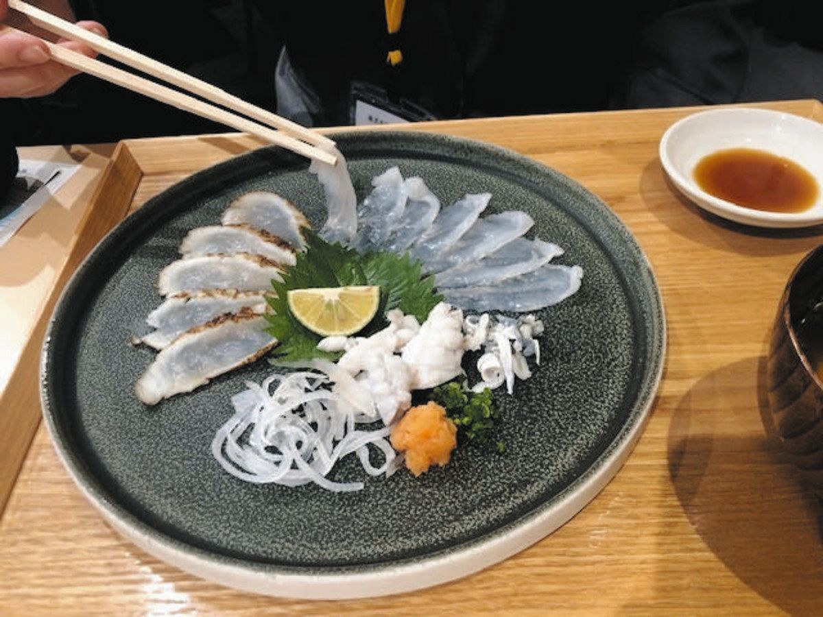 イベントでは地元の漁師と仲買人によるトークセッションがあり、徹底した資源管理をしたり、底(そこ)はえ縄と呼ばれる漁具を使ったりすることで天然トラフグを守り続けていることを紹介。地元料理人があのりふぐのてっさ=写真=や、ふぐ汁などの料理を振る舞った。