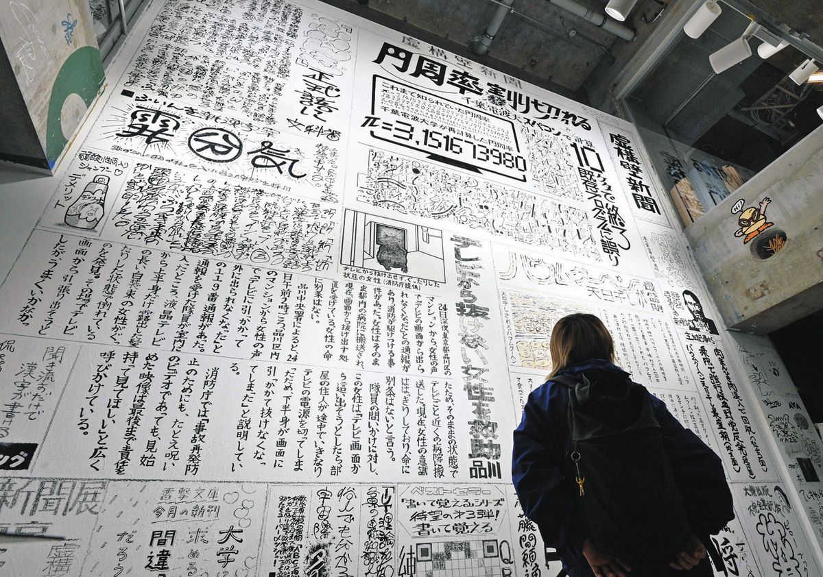 虚構新聞の本格的な展覧会は3~4月に大阪で初めて開催され、今回、東京でも実現した。展示品のほとんどを制作した現代工作家ミズグチグッチさん(51)は「これを楽しめる生き方の人は何でも楽しめる」と語る。壁新聞は東京のみの特別企画で、ミズグチさんら6人のアーティストが壁にじかに書いた。「バウムクーヘン天日干しが最盛期」といったこれまでの人気記事が並び、記事の下にはうその書籍広告も。スクラップは自由に手に取れる。