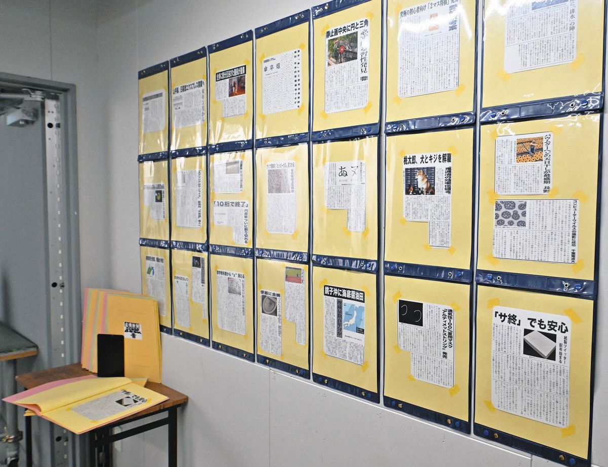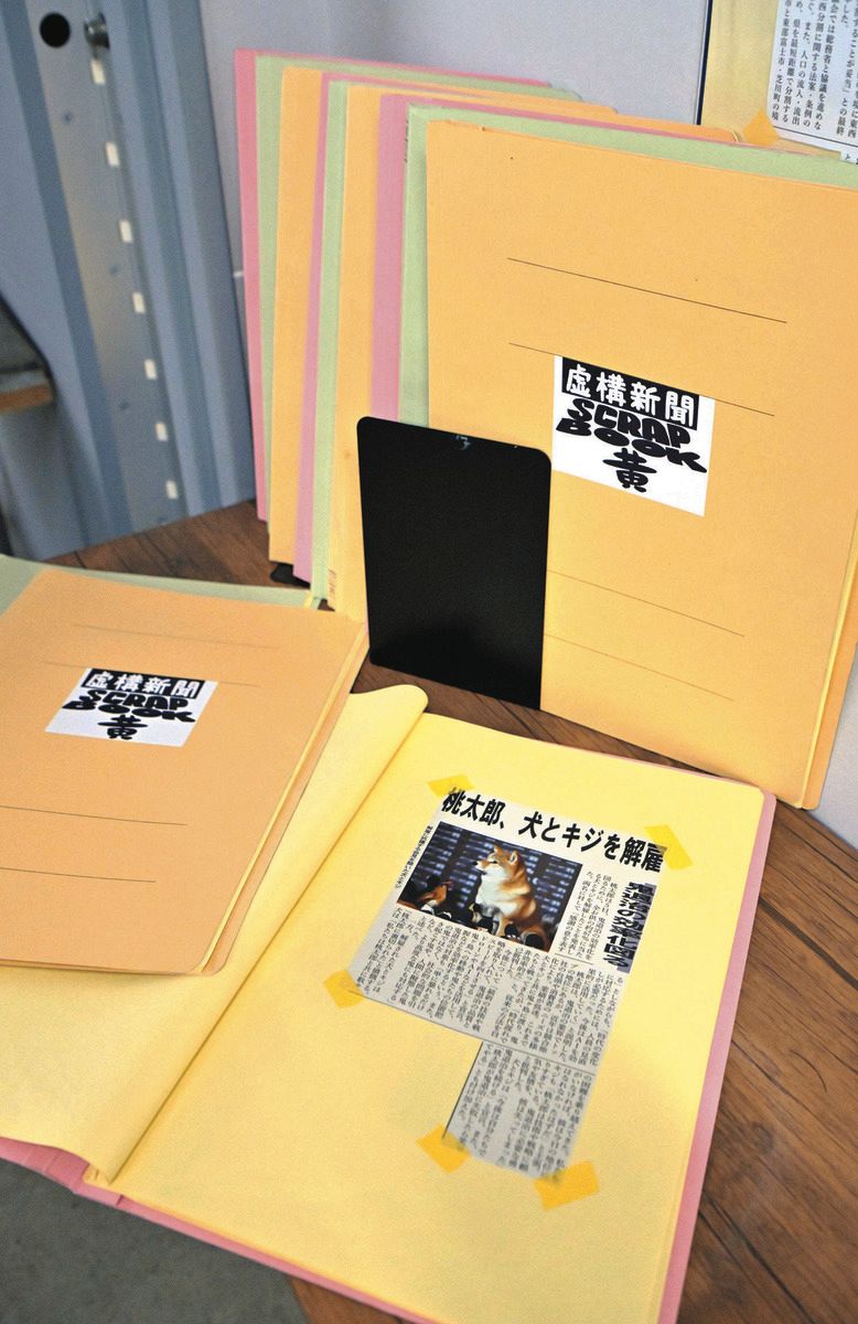 「桃太郎、犬とキジを解雇」などの記事を集めた虚構新聞のスクラップブック=中央区で