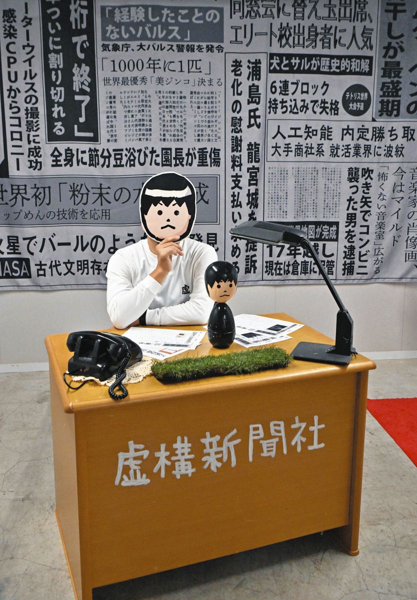 展示されている虚構新聞社のデスクには社主UKさんの人形やお面もある=中央区で