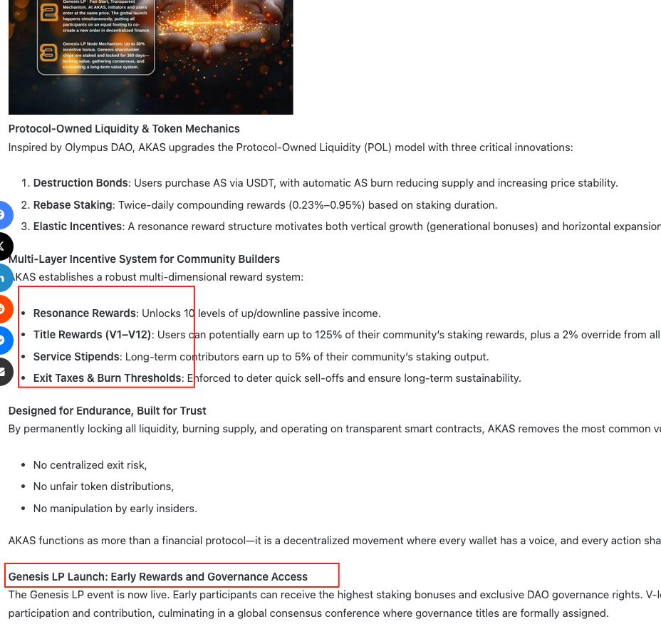 暗号資産の世界に長くいると、あるパターンが見えてきます。「公平」や「分散型」を大声で叫ぶプロジェクトほど、オンチェーンを開いて確認すべきです。最近話題の AKAS フルチェーンプロトコルがその好例です。プレスリリースには、グローバルフェアローンチ、プレセールなし、LP永久ロック、最大30%の初期ボーナス(毎日0.5%減少)、10段階レゾナンス報酬など、投資家を惹きつけるキーワードが並び、メディア報道も加わっています。経験の浅い投資家には「理想的な分散型プロジェクト」に見えるでしょう。
