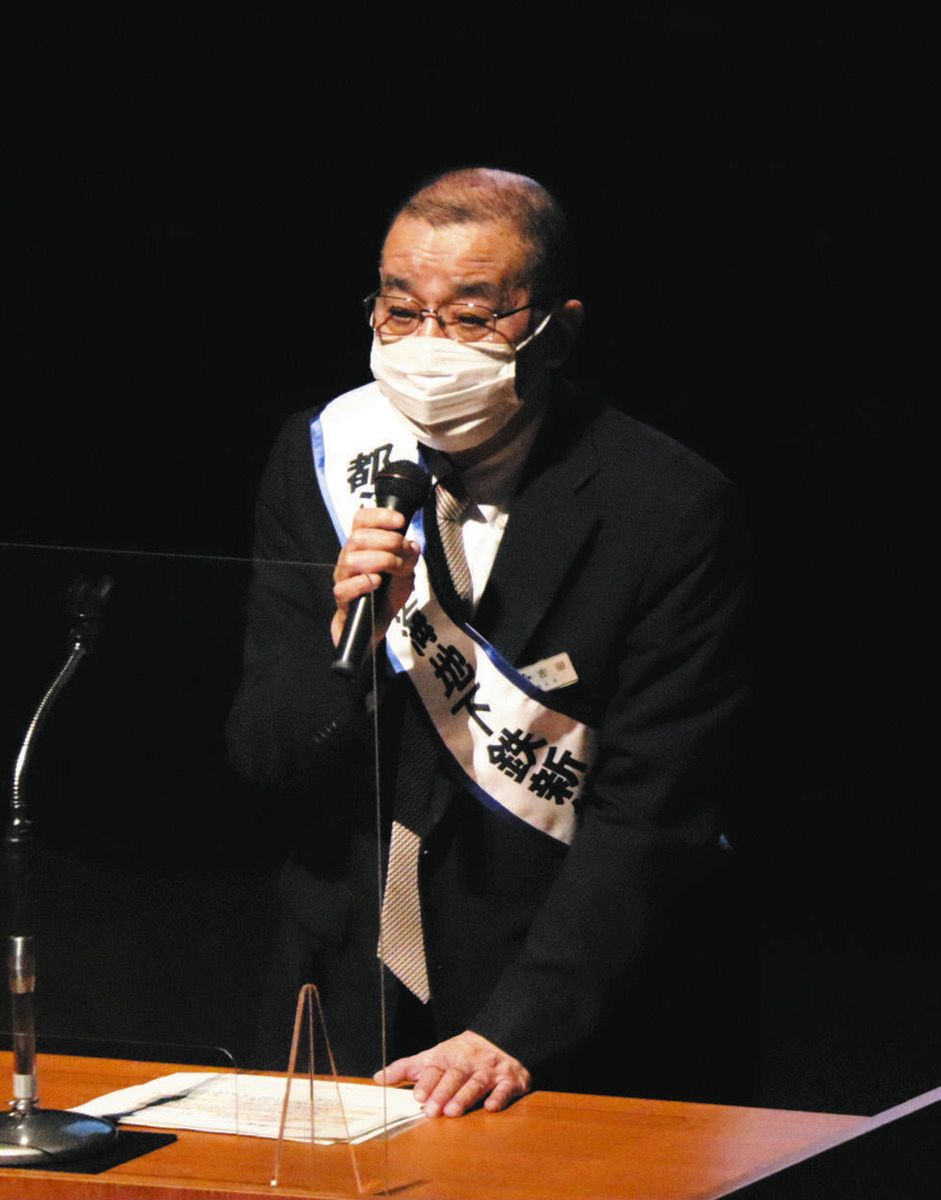 集会であいさつする吉田不曇副区長=2021年、東京都中央区で