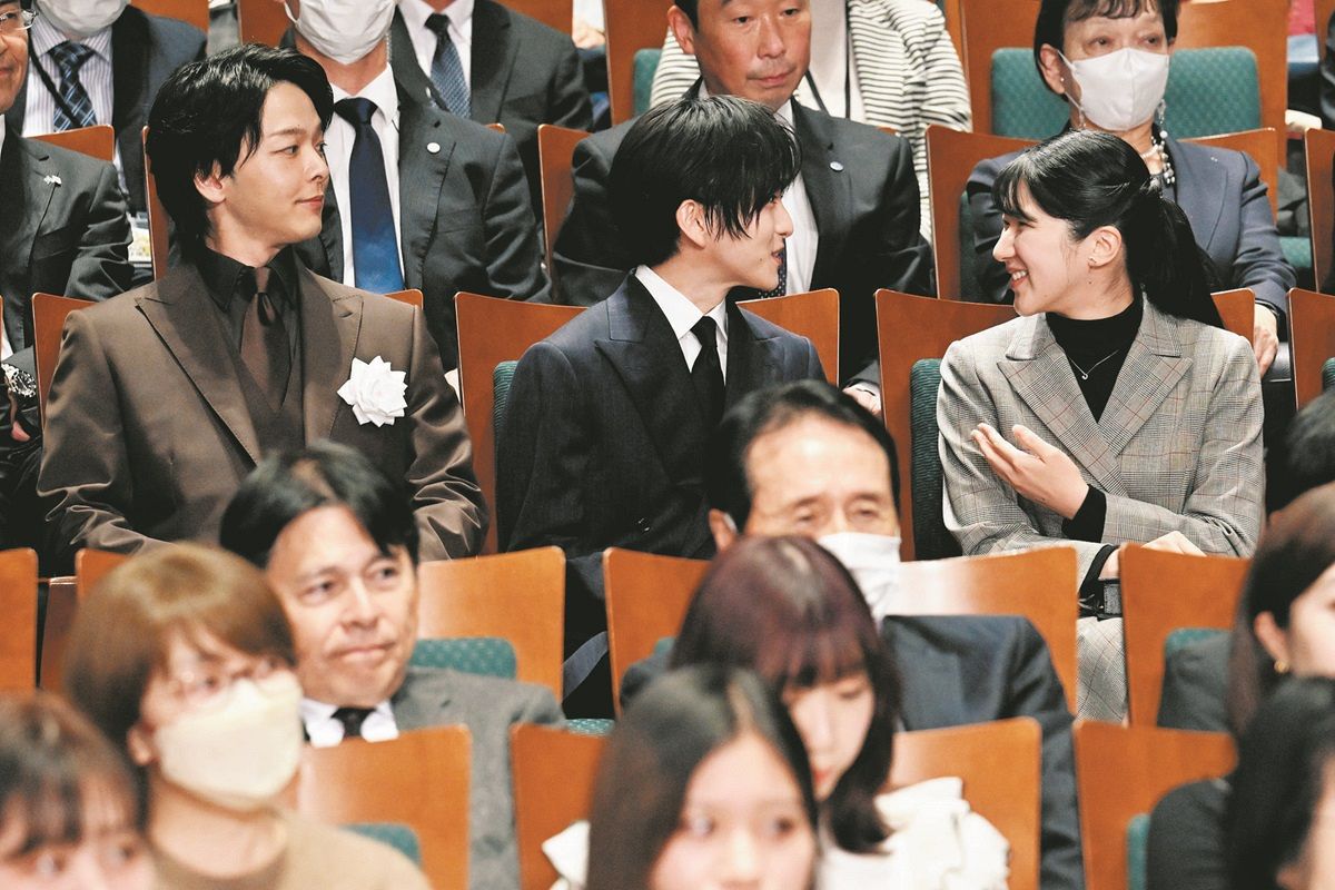 映画「ペリリュー楽園のゲルニカ」チャリティー上映会に出席された天皇、皇后両陛下の長女愛子さま。前列左は声優を務めた俳優の中村倫也さんと板垣李光人さん(同2人目)=27日、東京都千代田区で(代表撮影)