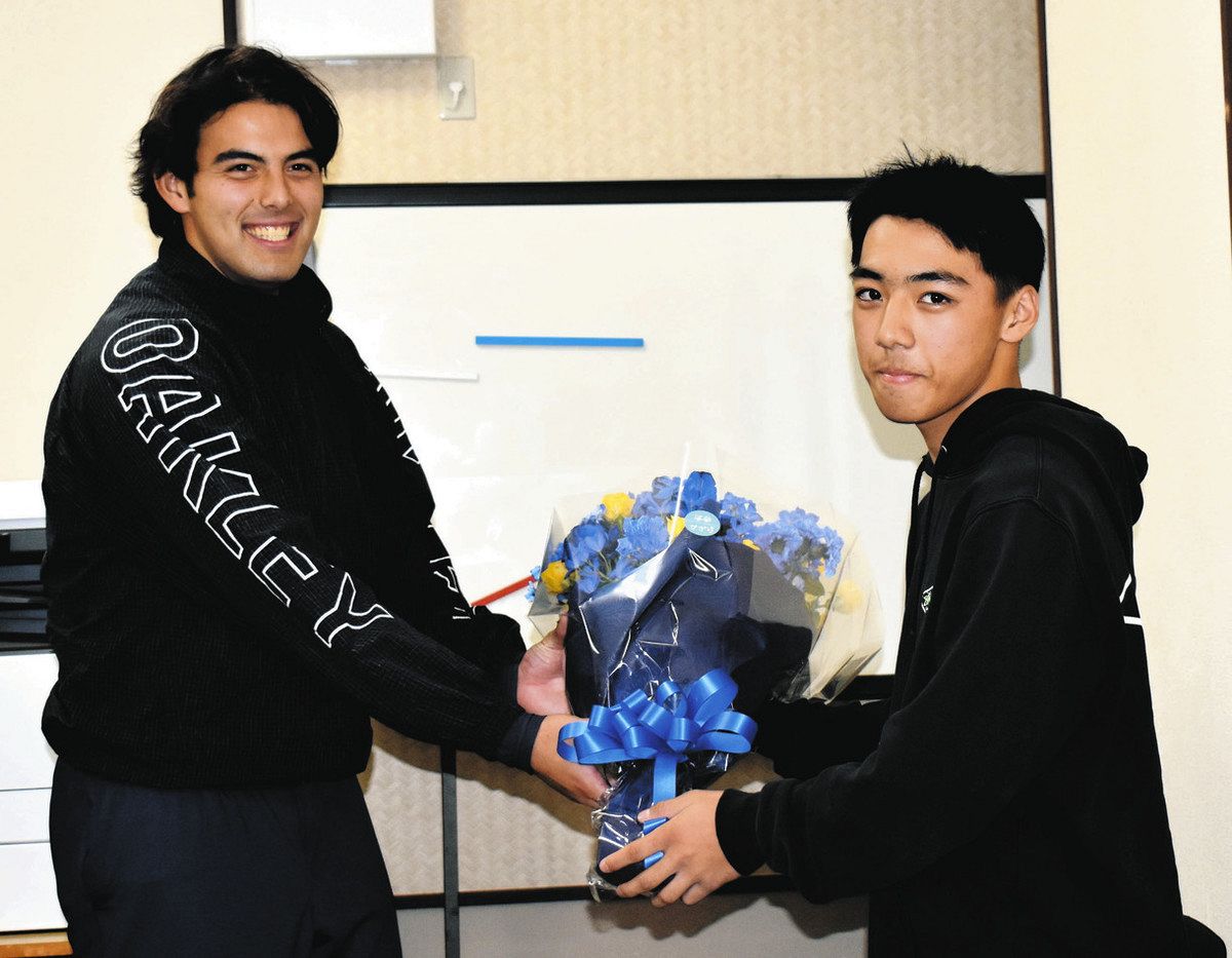 東京都台東区立駒形中学校野球部出身で、今秋のドラフト会議でオリックス・バファローズから育成枠2位指名されたシャピロ・マシュー・一郎投手(22)が11月30日、母校を訪問してOBや現役部員らと交流した。
