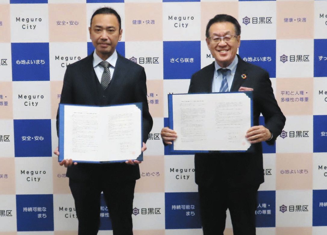 協定書を交わした青木英二区長(右)と鈴木伸彦社長=目黒区役所で