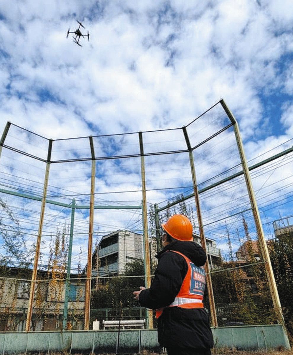 ドローンを使った災害訓練の様子=目黒区で