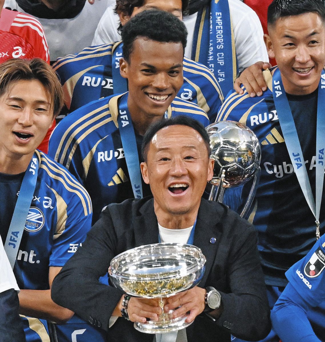 天皇杯を手に喜ぶFC町田ゼルビアの黒田剛監督(手前)と望月ヘンリー海輝(奥中央)ら=11月22日、国立競技場で(芹沢純生撮影)
