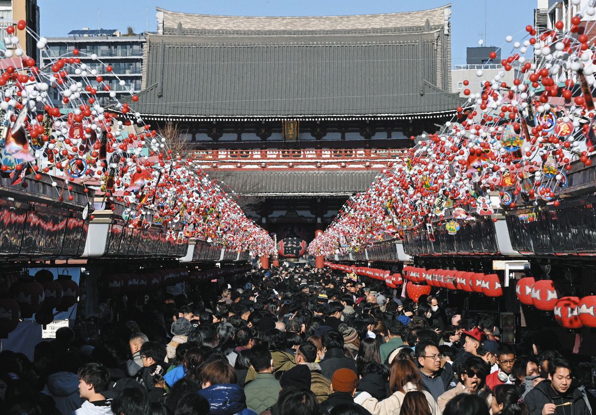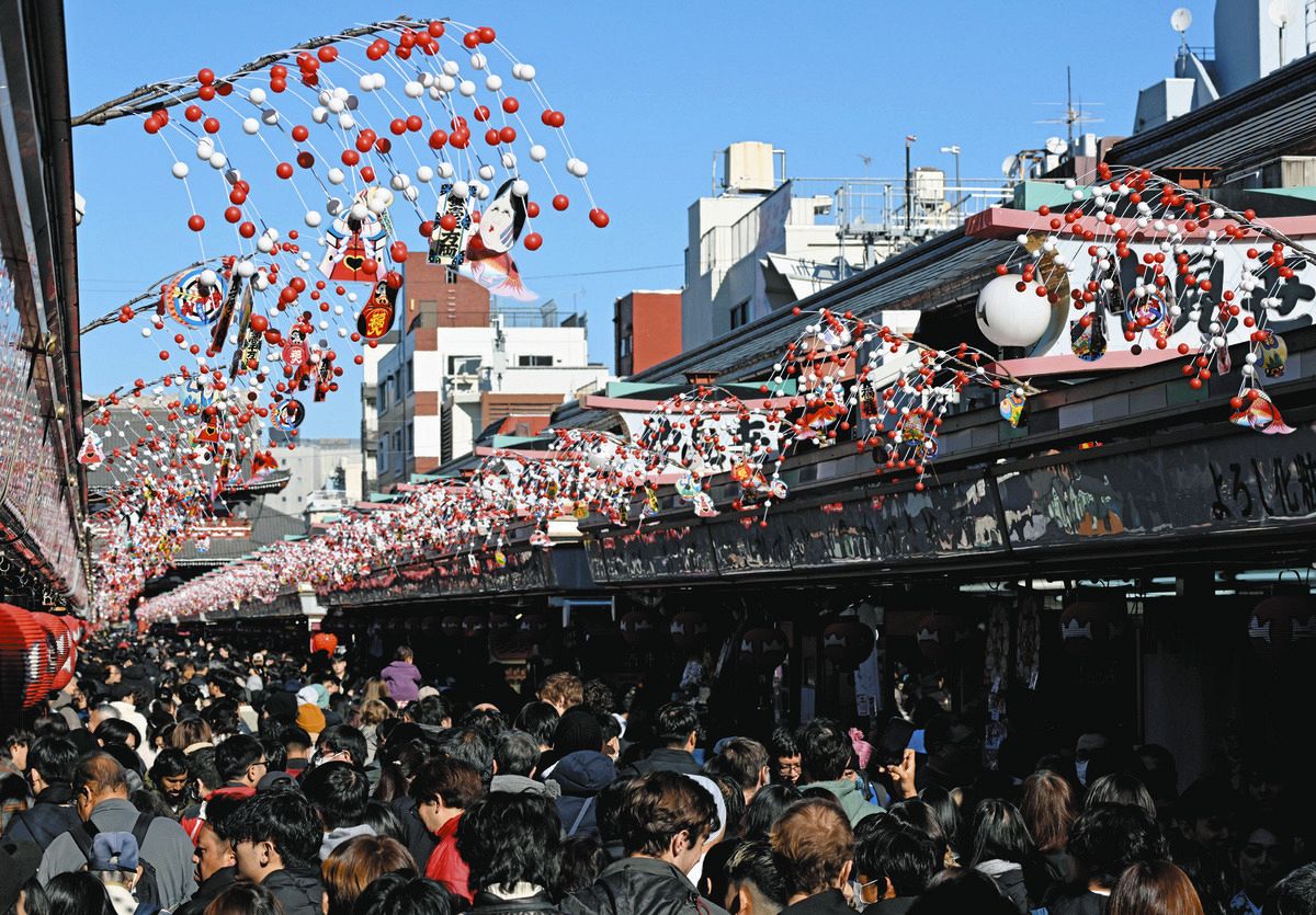 通りの両脇から紅白の繭玉、縁起物の宝船や鯛(たい)などの絵札がつり下げられ、華やかな雰囲気に。観光客らは写真を撮ったり、うっとりと眺めたりして楽しんでいた。仲見世商店街振興組合事業対策本部長の荒井良太さん(46)は「国内外の人に日本の伝統的な正月を味わってもらえれば」と話した。