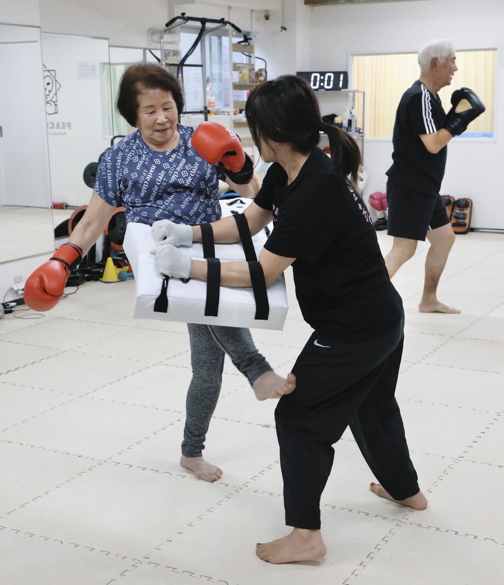 小田急線豪徳寺駅から徒歩5分のビル3階にキックボクシングジム「PEACE PACE」(ピースペース)はある。平日午後1時からのクラスは70歳以上が対象で、相談に応じて60代の人も受け付ける。