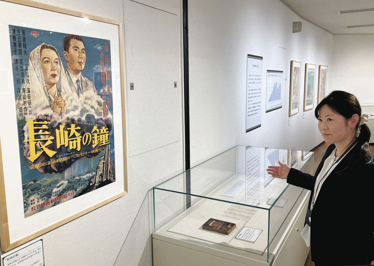 原作が書き換えられた上で上映が認められたとされる『長崎の鐘』のポスター。関連する資料も紹介している=いずれも千代田区の昭和館で