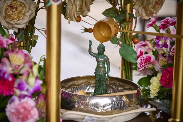 行事の見どころは、お稚児さんの練り行列。華やかな衣装を纏(まと)った子どもたちが列を成して、地域の人々や参拝者に祝福されながら境内を練り歩きます。練り行列のあと、健やかな成長を祈願して法楽が捧げられます。お稚児さん代表による献灯・献花・献香に続き、お稚児さん一人ひとりが甘茶をお釈迦様の誕生仏像に注ぐ灌佛を行います。さらにお導師さまよりお加持(かじ)を頂戴し、お守りが授与されるのもこの日の大切な流れ。華やかな衣装と、静かな所作が交差する場面に、春の祈りの輪郭が浮かび上がります。