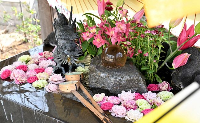 水に浮かぶ華やかな花が美しい法輪寺(新宿区)の花手水。コロナ禍の時、ひしゃくを持つのをためら参拝者へのもてなしとして住職が始めたもの。...